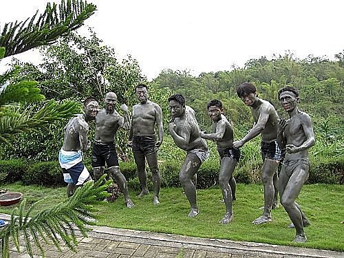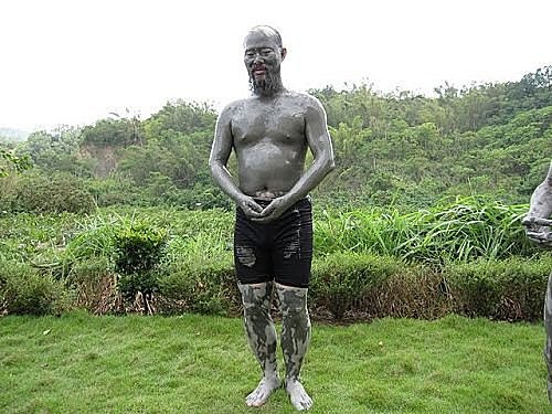 男士們穿上短褲在營大門前敷均全身,女士們就大伙兒在後園敷,由於肉帛相見,所以女士們都沒有拍照耶