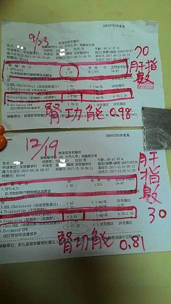 肌酸酐:0.98降到0.81 腎絲球過濾速率:78.02上升到98.20